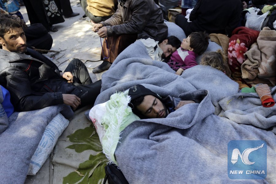 Syrian civilians, evacuated from rebel-held areas in Eastern Ghouta, gather at a school in the Adra district on the northeastern outskirts of the capital Damascus on March 16, 2018. (Xinhua/AFP)