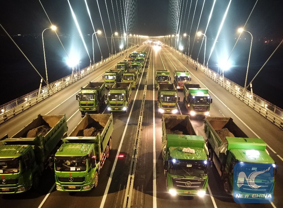 Heavy trucks conduct a loading test on the ten-year-old Sutong Bridge linking Nantong and Suzhou cities in east China's Jiangsu Province, Feb. 27, 2018. The 32.4-km-long suspension bridge, which was open to traffic in 2008, is a major project of highway framework across the Yangtze River in Jiangsu Province. (Xinhua/Xu Congjun)