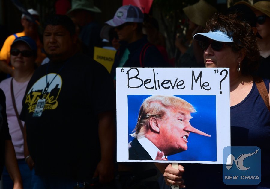 Activists carry placards with political points of view gather before marching through downtown Los Angeles on June 3, 2017, in the March For Truth, part of a peaceful nationwide demonstration aimed at restoring faith in American Democracy and the U.S. electoral system. (Xinhua/AFP)