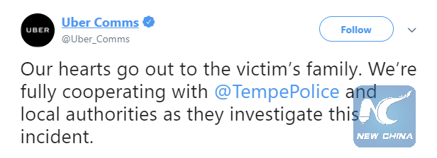 "Our hearts go out to the victim's family," Uber said on its official Twitter page, "We're fully cooperating with @TempePolice and local authorities as they investigate this incident."