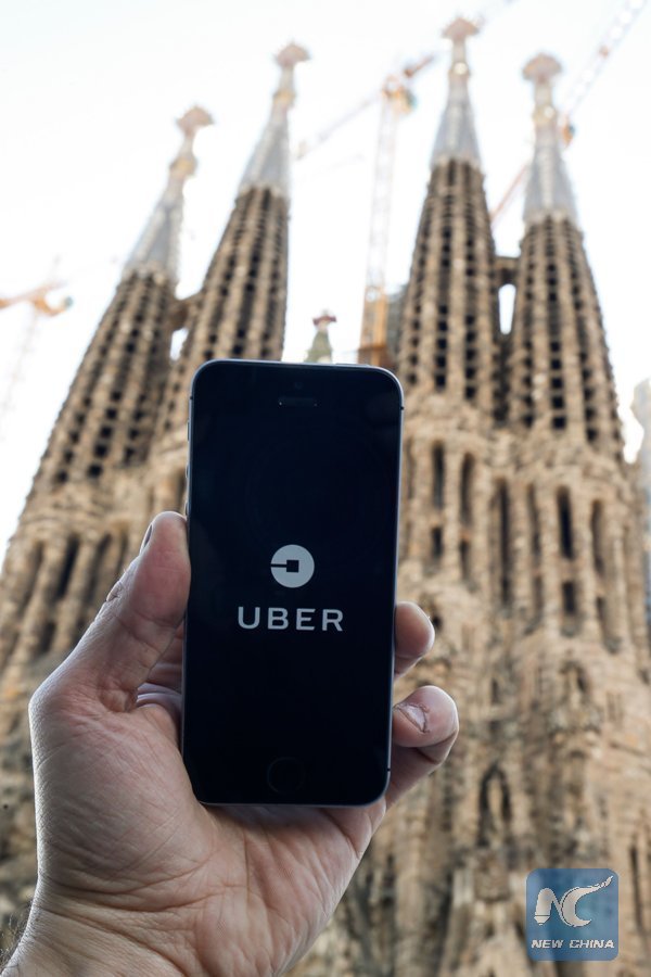 File Photo: A phone displays the Uber app next to the Sagrada Familia in Barcelona on March 13, 2018. (Xinhua/AFP)