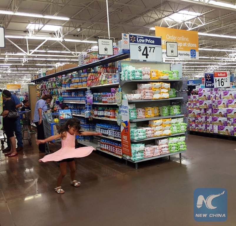 A girl dances at a Walmart Supercenter in El Centro, the largest city in the Imperial Valley, the United States, near the U.S.-Mexico border, on Aug. 16, 2017. (Xinhua/Guo Shuang)