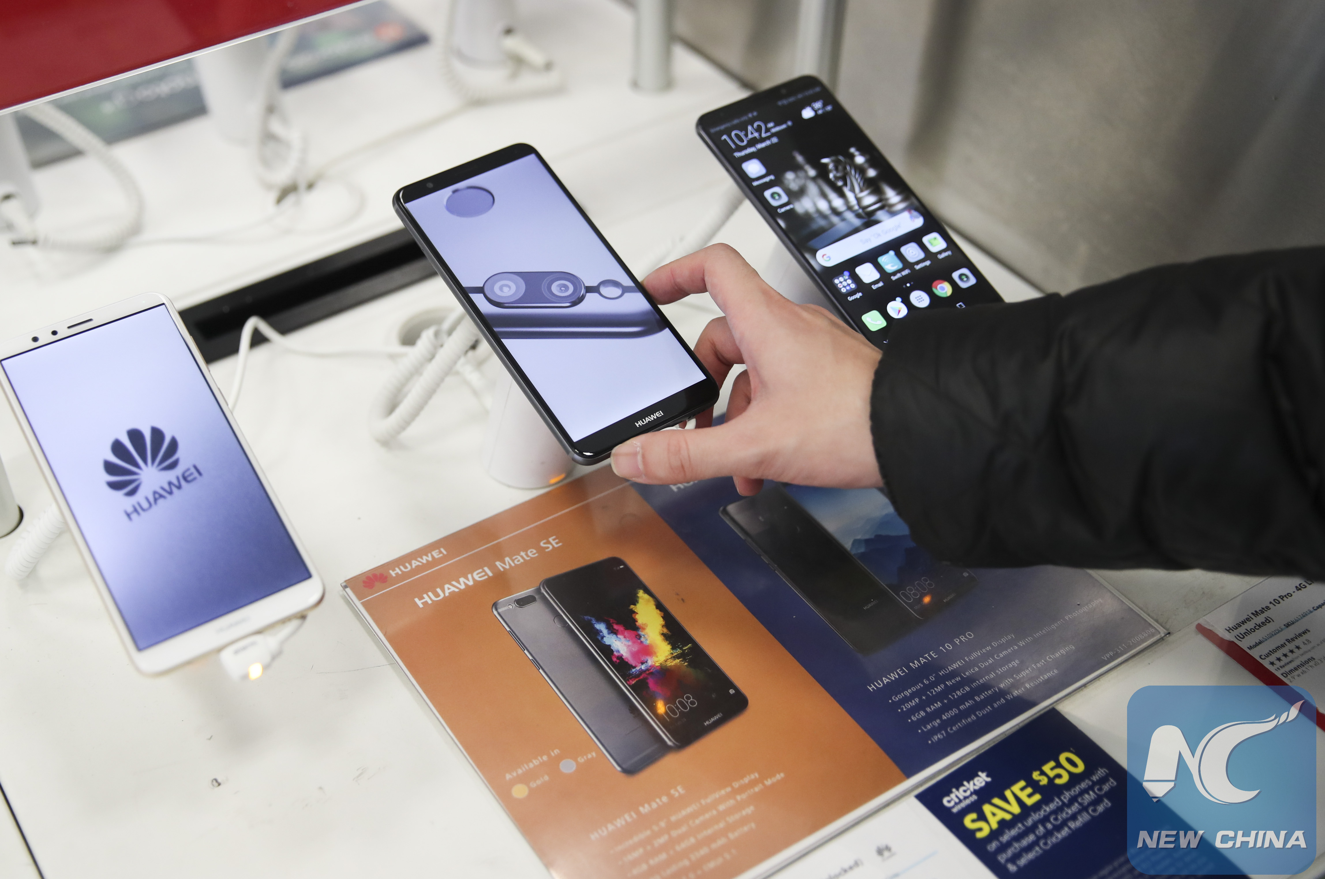 A man tries a mobile phone made in China at a Best Buy store in New York, the United States, on March 22, 2018. (Xinhua/Wang Ying)