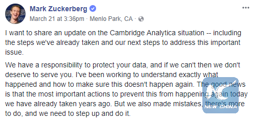 Mark Zuckerberg's post about the data breach on his Facebook page.