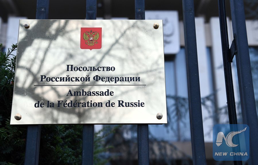 File photo taken on Feb. 14, 2017, shows a plaque at the embassy of the Russian Federation in Paris. (Xinhua/AFP)