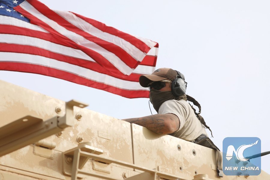 A member of U.S forces rides on a military vehicle in the town of Darbasiya next to the Turkish border, Syria, April 28, 2017. (Xinhua/REUTERS)