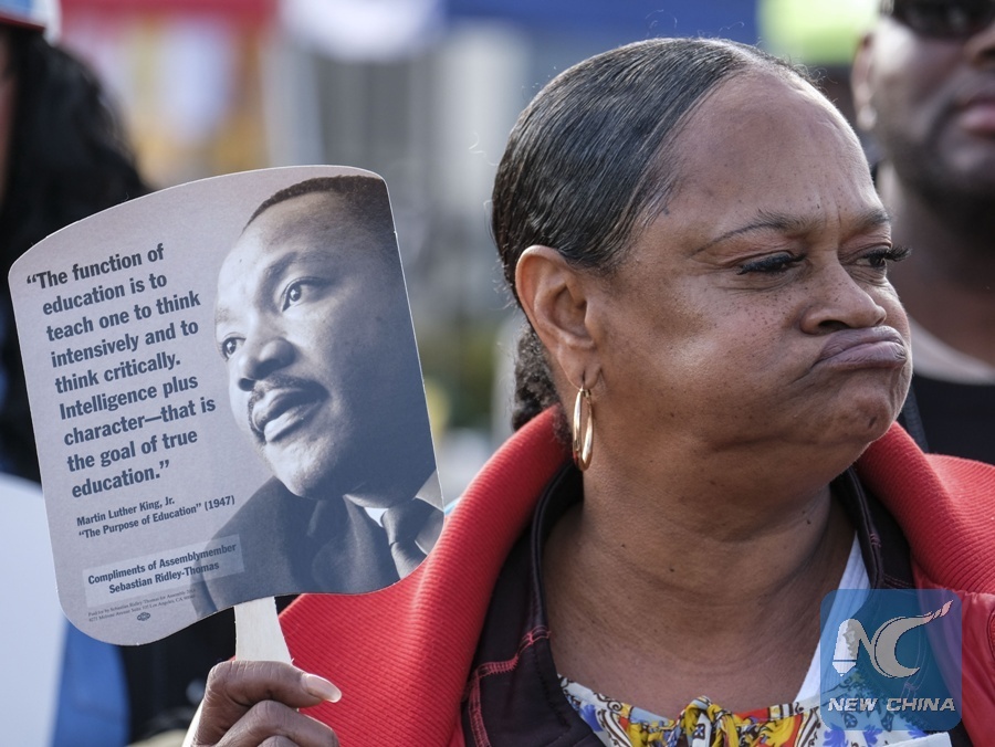 A spectator holds a picture of Martin Luther King Jr. in the 32nd annual Kingdom Day Parade in Los Angeles, the United States, Jan. 16, 2017. The annual Kingdom Day Parade is held to honor the civil rights leader Martin Luther King Jr. and this year's theme is "Now More Than Ever, We All Must Work Together." (Xinhua/Zhao Hanrong)