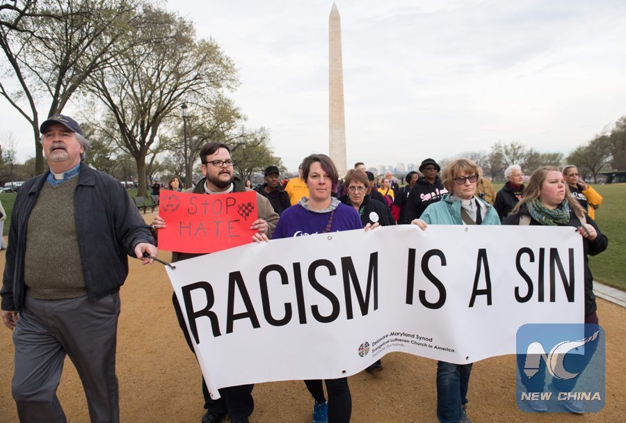 People commemorating the 50th anniversary of the assassination of Rev. Martin Luther King, Jr., hold a silent prayer walk from the Martin Luther King Jr. Memorial past the Washington Monument to the National Mall in Washington, D.C., April 4, 2018. (Xinhua/AFP)