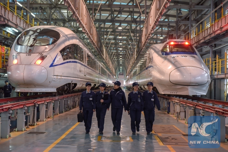 Yang Xue, Li Huihui, Chen Xuan, Chen Yingying and Rong Rong (L-R), who are members of the high-speed train maintenance staff at Hefei South Railway Station, are pictured at a service depot in Hefei, capital of east China's Anhui Province, March 6, 2018. (Xinhua/Guo Chen)