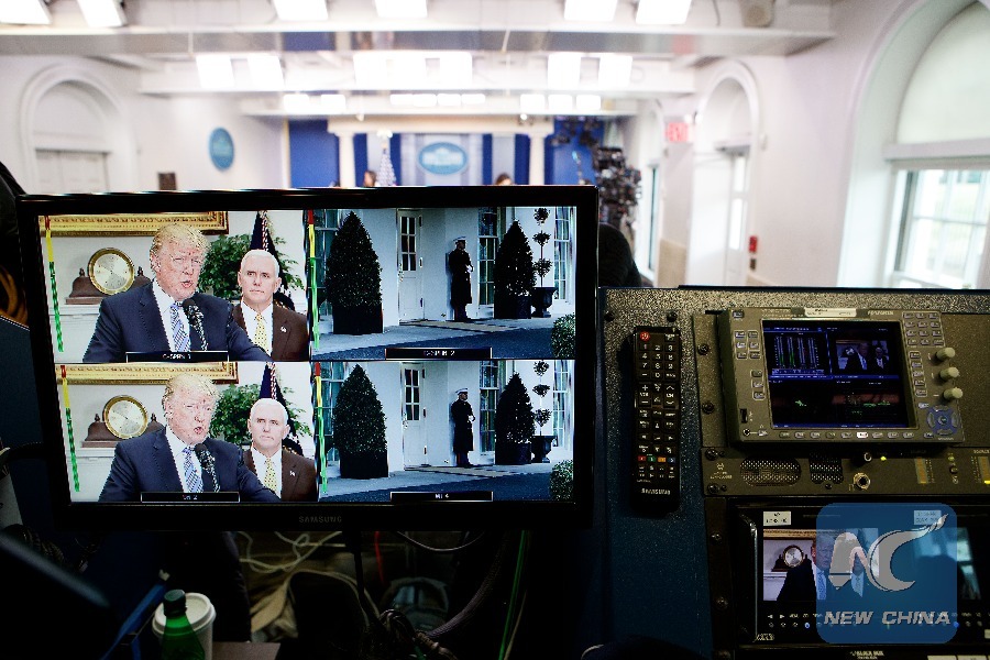 U.S. President Donald Trump is seen on a TV screen announcing tariffs on steel and aluminum, at the White House in Washington D.C., the United States, on March 8, 2018. (Xinhua/Ting Shen)