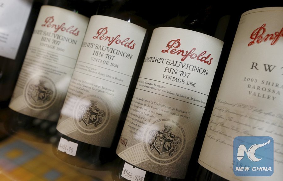 Bottles of Penfolds wines, one of the brands from the Treasury Wines group, are shown at a Sydney boutique wine store, Feb. 15, 2016. (Xinhua/REUTERS)