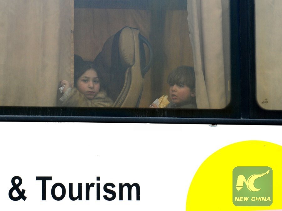 Children look through a bus window as rebels and their families evacuate from Eastern Ghouta area in Damascus, Syria, on March 28, 2018. (Xinhua/Ammar Safarjalani)