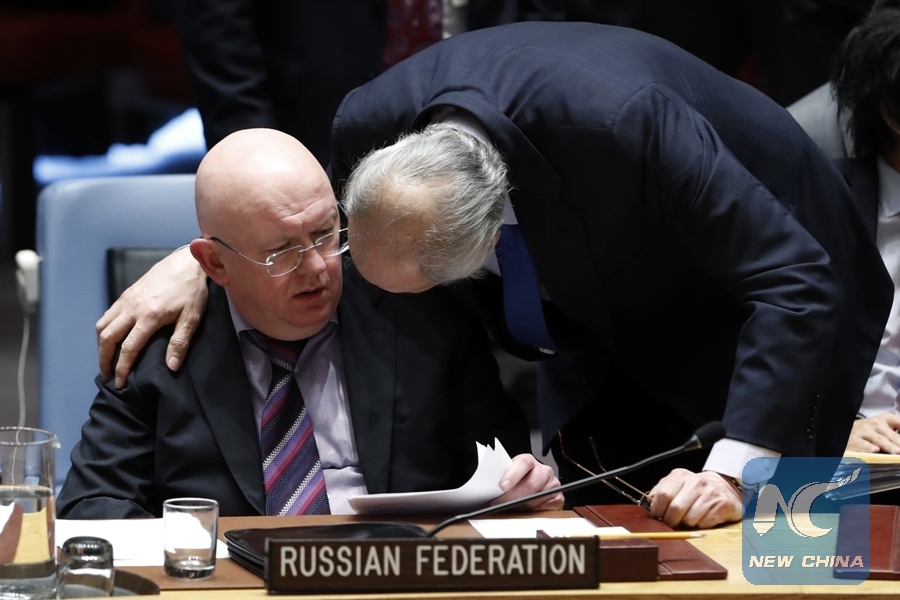 Russian Ambassador to the United Nations Vassily Nebenzia (L) listens to Syrian Ambassador to the United Nations Bashar Jaafari prior to the United Nations Security Council voting on a Russian-drafted resolution on an investigation by the Organization for the Prohibition of Chemical Weapons (OPCW) into the alleged chemical attack in Douma, Syria, at the UN headquarters in New York, on April 10, 2018. (Xinhua/Li Muzi)