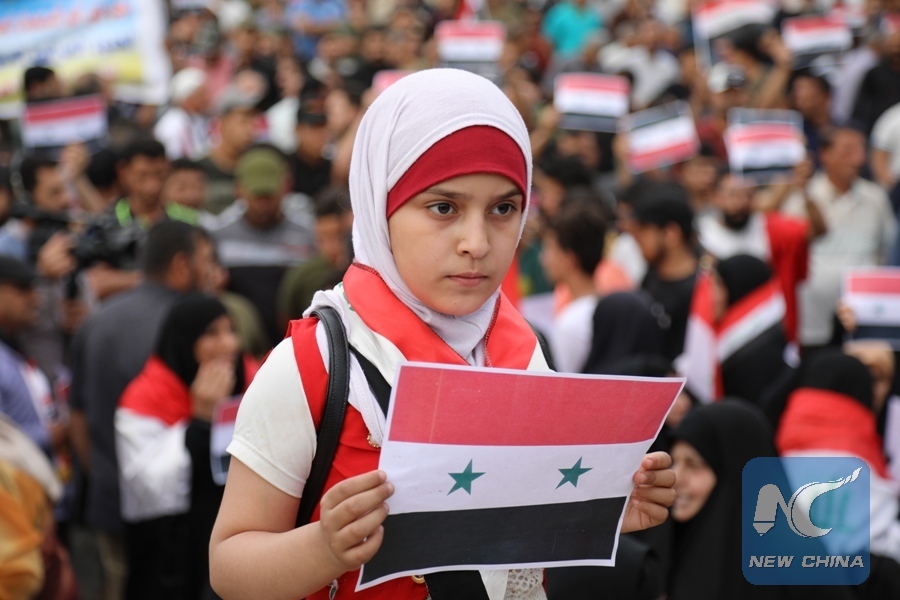 A girl holding a Syrian flag participates in a protest against U.S.-led attacks on Syria, at Tahrir Square, Baghdad, Iraq, on April 15, 2018. Thousands of Iraqis rallied Sunday in downtown Baghdad to protest against U.S.-led attacks on Syria. (Xinhua/Khalil Dawood)