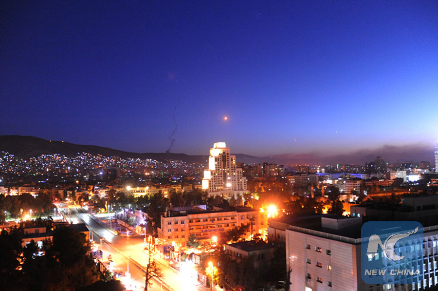 Surface-to-air missiles were seen in the sky over Syria's capital Damascus on April 14, 2018, as the Syrian air defenses were responding to the U.S.-led missile attack on Syria. (Xinhua/Ammar Safarjalani)