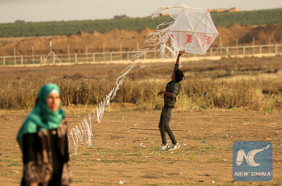 Palestinian protesters prepare kites laden with a molotov cocktail before flew its over the border before cutting the string leaving the burning material to fall in Israeli territory, on the border between Israel and the Gaza Strip, east of Gaza City, on April 18, 2018. (Xinhua photo)