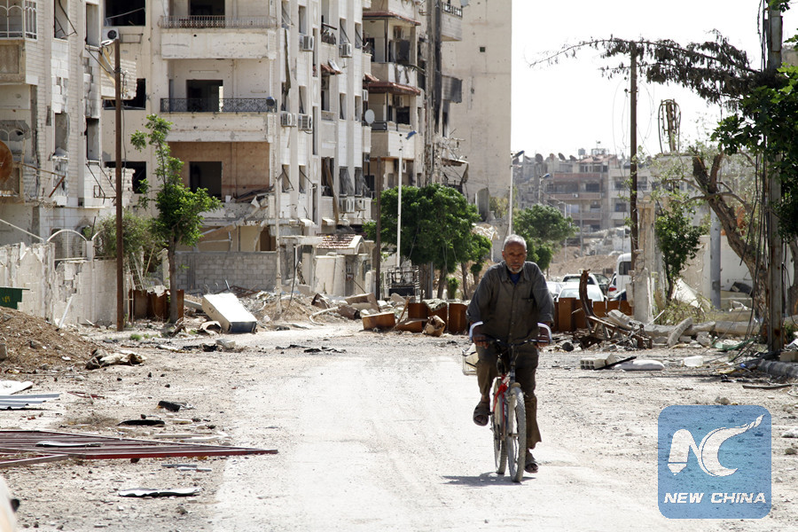 A Syrian man rides his bicycle in Douma district, east of the capital Damascus, on April 20, 2018. (Xinhua/Hummam Sheikh Ali)