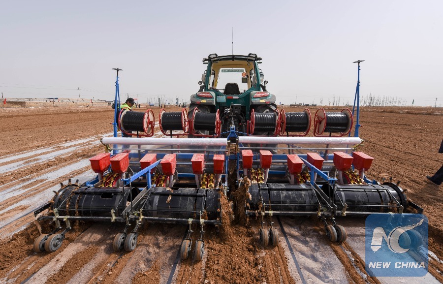 A self-driving tractor sows cotton seeds in the field. (Xinhua/Hu Huhu)