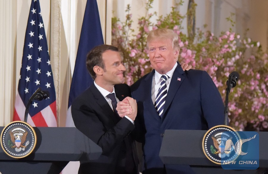 U.S. President Donald Trump (R) and French President Emmanuel Macron shake hands at a joint press conference at the White House in Washington D.C., the United States, April 24, 2018. (Xinhua/Yang Chenglin)