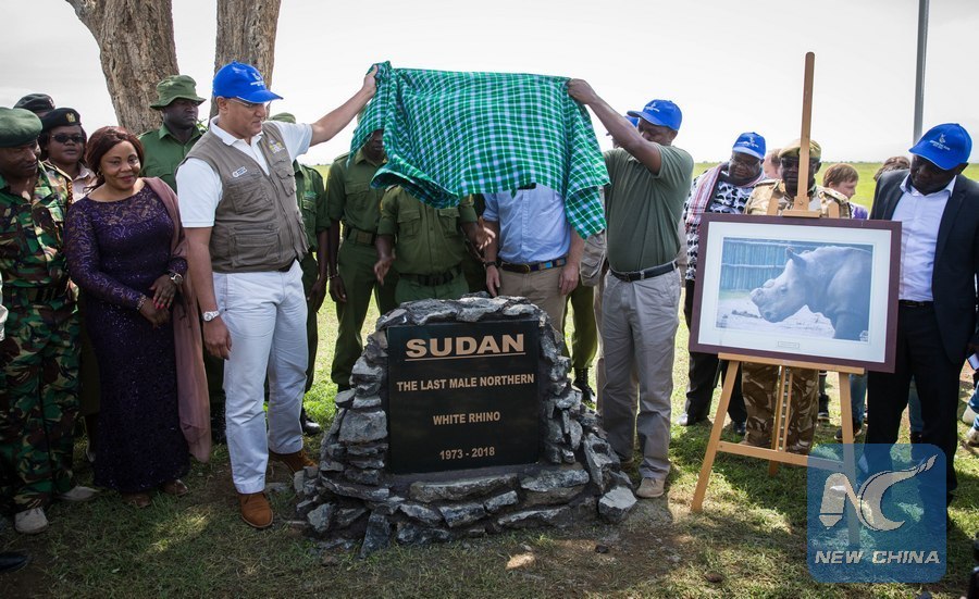 Kenyan Cabinet Secretary for Tourism and Wildlife Najib Balala (3rd L, front) unveils the tombstone of Sudan, the late world's only remaining male northern white rhino, in Ol Pejeta Conservancy in Laikipia county, northern Kenya, March 31, 2018. Kenyan wildlife officials and global wildlife conservationists on Saturday converged at Ol Pejeta Conservancy in northern Kenya where a memorial service for the late world's only remaining male northern white rhino fondly named Sudan took place. (Xinhua/Lyu Shuai)