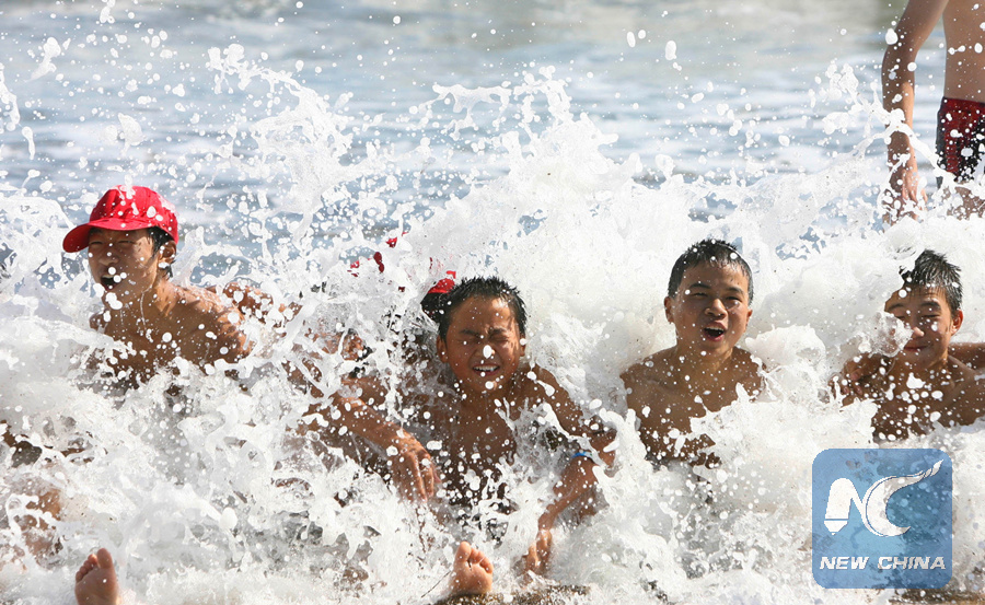 Chinese children from China's quake-hit Sichuan Province play at the beach of Vladivostok, Russia, Aug. 4, 2008. (Xinhua/Zheng Yue)
