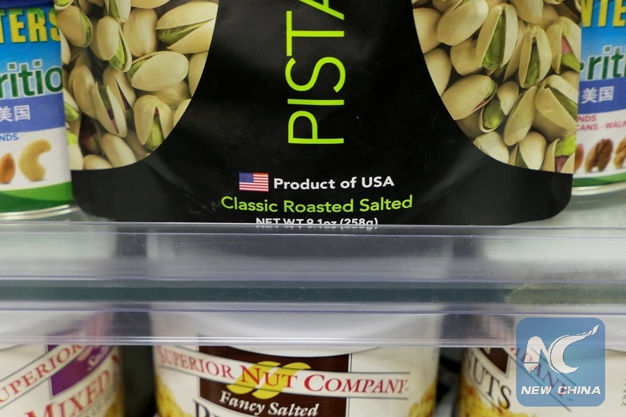 A bag of pistachios produced in the United States is placed among nuts and photographed in a shop in Beijing, China April 6, 2018. (Xinhua/REUTERS)