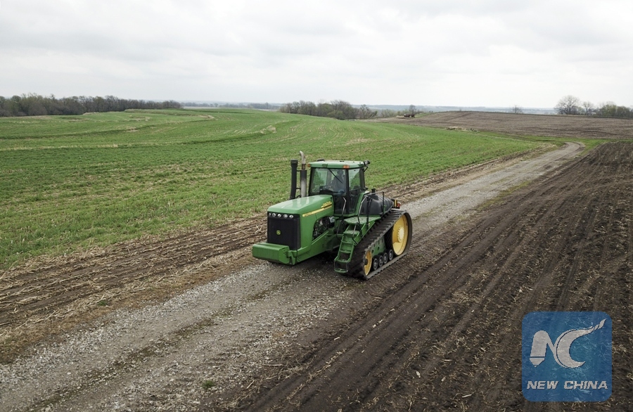Rick Kimberley operates a tractor at his farm near Des Moines, capital of Iowa State, May 3, 2018. Rick and his son, Grant, grow more than 4,000 acres of corn and soybeans. (Xinhua/Wang Ying)