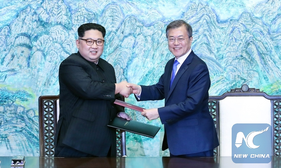 South Korean President Moon Jae-in (R) and Kim Jong Un, top leader of the Democratic People's Republic of Korea (DPRK) exchange their joint declaration, titled the Panmunjom Declaration for Peace, Prosperity and Unification of the Korean Peninsula, at Peace House on the South Korean side of Panmunjom, on April 27, 2018. (Xinhua/Inter-Korean Summit Press Corps)