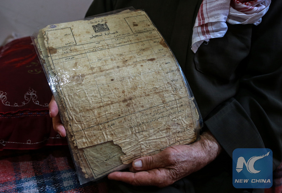 80-year-old Palestinian refugee Suleiman Radwan holds land certificate inside his house in a refugee camp in Gaza Strip. (Xinhua)