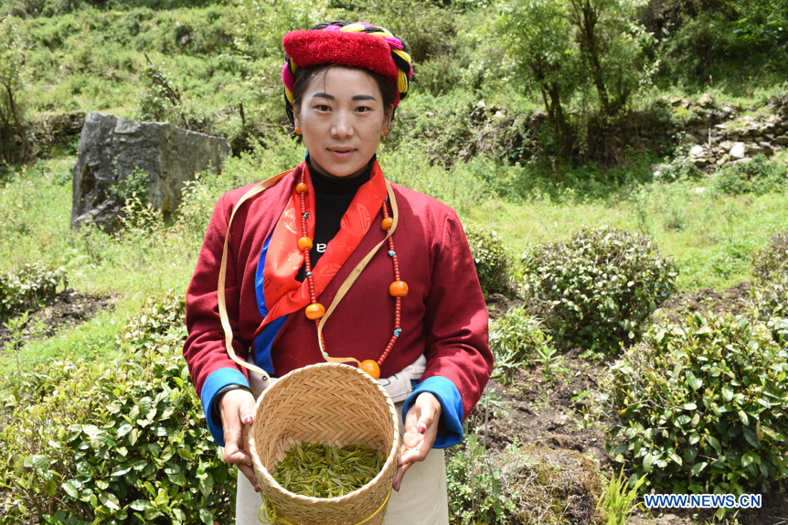A member of tea farmers and herdsmen professional cooperative shows the tea leaves she picks in a tea garden in Le Menba Ethnic Township of Cuona County in Shannan, southwest China's Tibet Autonomous Region, May 12, 2018. The tea cooperative was founded in 2011. In 2017, the income per capita of the township increased by about 12,000 yuan under the cooperative. Tea industry has now become one of the most important driving forces of local economy. (Xinhuanet/Chen Lin)