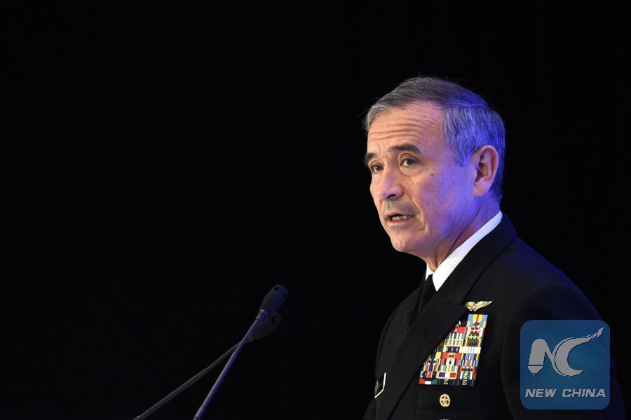In this file photo taken on October 17, 2017 Admiral Harry B Harris, Jr, Commander, United States Pacific Command delivers a speech at the 30th International Institute for Strategic Studies (IISS) Fullerton Lecture in Singapore. (Xinhua/AFP PHOTO)
