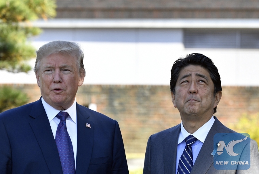 U.S. President Donald Trump (L) meets with Japanese Prime Minister Shinzo Abe upon his arrival at the Kasumigaseki Country Club in Kawagoe, near Tokyo, Japan, Nov. 5, 2017. (Xinhua Photo)