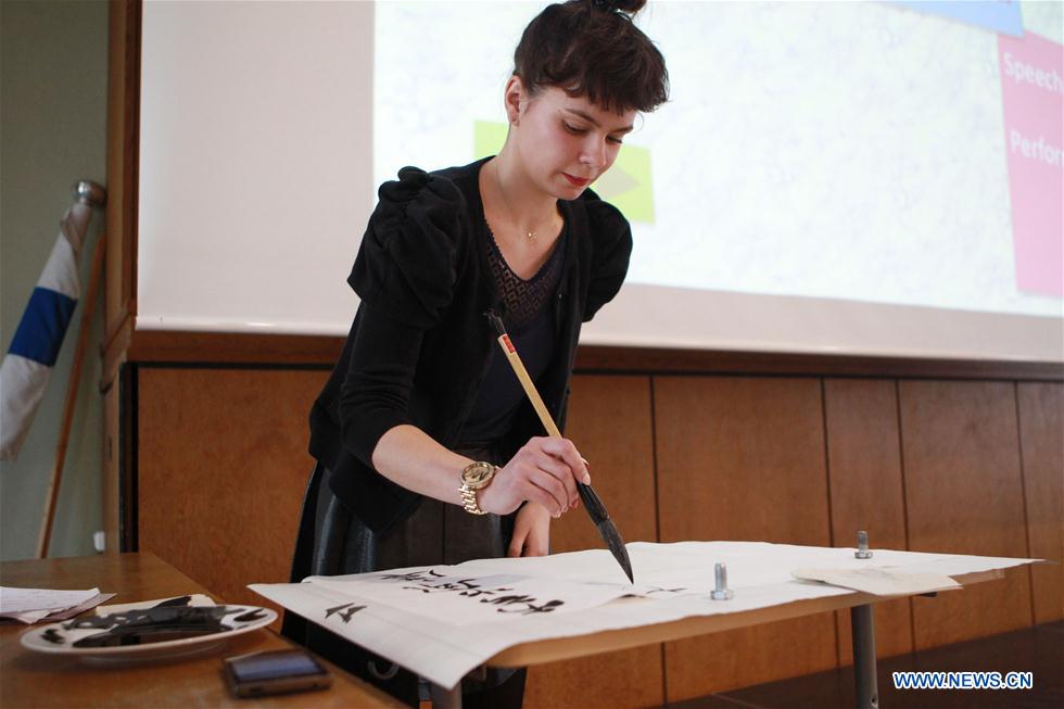 Jolanta Zabicka performs Chinese calligraphy during the "Chinese Bridge" competition in Helsinki, Finland, on April 21, 2017. In recent years, a surge in the learning of the Chinese language has been observed around the world. Confucius institutes and classrooms worldwide play an undeniable role in the process of bringing the Chinese language and culture closer to the international community.