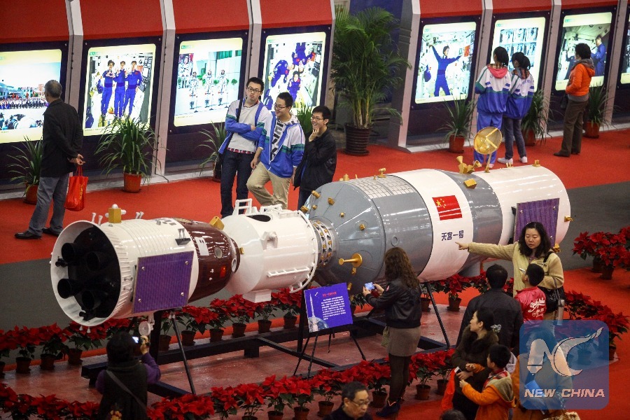 People look at a model of the Shenzhou-10 manned spacecraft docked with Tiangong-1 space lab module during an exhibition in Tianjin, north China, Nov. 9, 2013. (Xinhua/Li Xiang)
