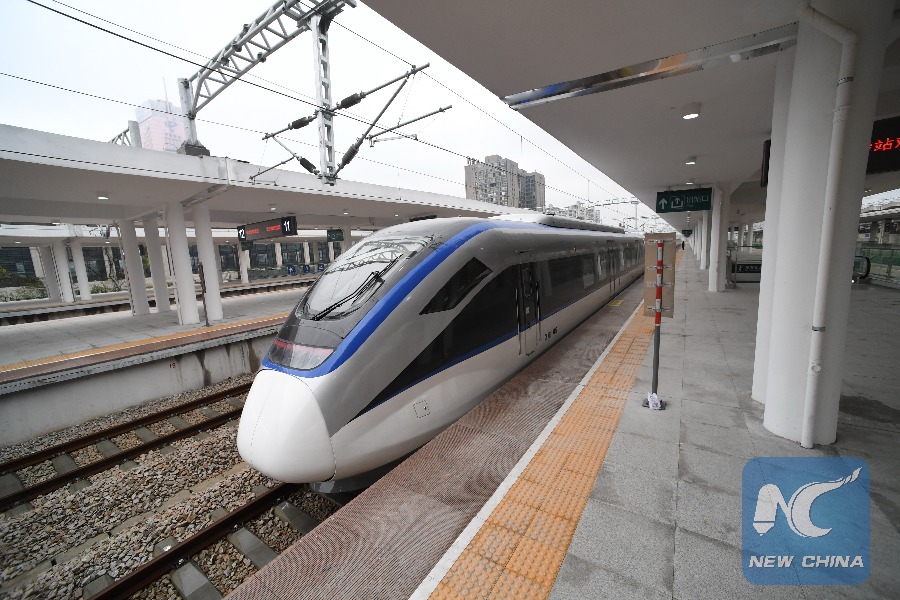 Photo taken on Dec. 26, 2016 shows a train at the Changsha Station of the Changsha-Zhuzhou-Xiangtan Intercity Railway in central China's Hunan Province. The 95.5-km-long intercity railway was put into service on Monday, with a speed up to 160 km per hour at the initial operations. (Xinhua/Long Hongtao)