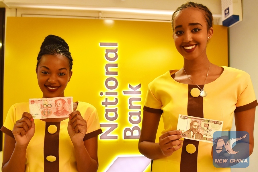 File photo shows two attendants display a Chinese currency note and a Kenyan Shilling note during the opening ceremony of a new branch of the National Bank of Kenya which will host a clearing house for Chinese renminbi (RMB) in Nairobi, Kenya, July 22, 2015. (Xinhua/Sun Ruibo)