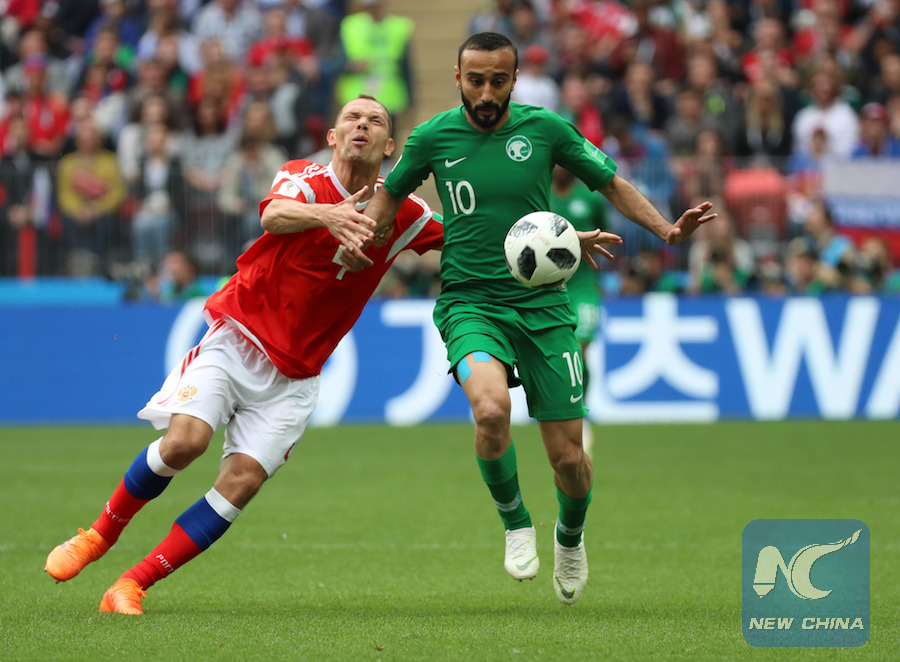 Logo of the Chinese brand Wanda, one of seven FIFA's global partners, showed at the side of the World Cup 2018 opener between Russia and Saudi Arabia in Moscow on June 14. (Xinhua/Yang Lei)