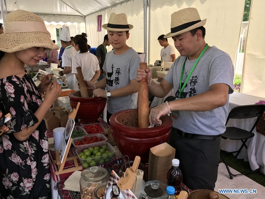 A visitor enjoys Thai food at the Thai Festival 2018 “Spice up Your Day with Thai Tastes”. The festival was held at the Royal Thai Embassy, Beijing, June 23, 2018. This is the second time that the Thai Festival is organised here as guests can enjoy various activities in the midst of Thai surroundings. (Xinhuanet/Liang Yurou)