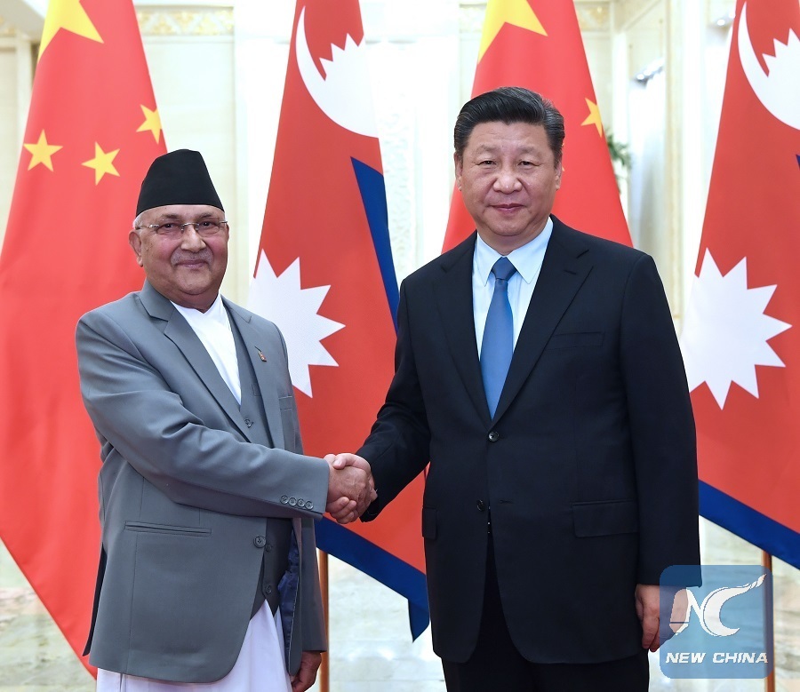 Chinese President Xi Jinping meets with Nepal's Prime Minister K.P. Sharma Oli at the Great Hall of the People in Beijing, capital of China, June 20, 2018. (Xinhua/Rao Aimin)