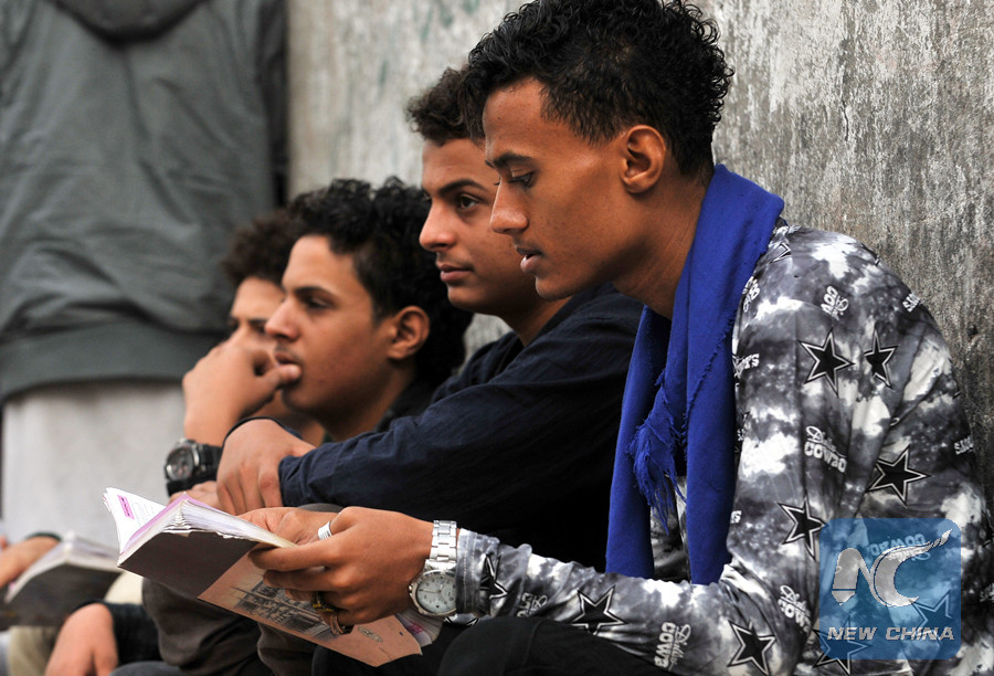 Secondary school students of the port city of Hodeidah review their information at an examination center in Sanaa, Yemen, before attending the final exam after fleeing the city due to conflict on June 30, 2018. (Xinhua/Mohammed Mohammed)