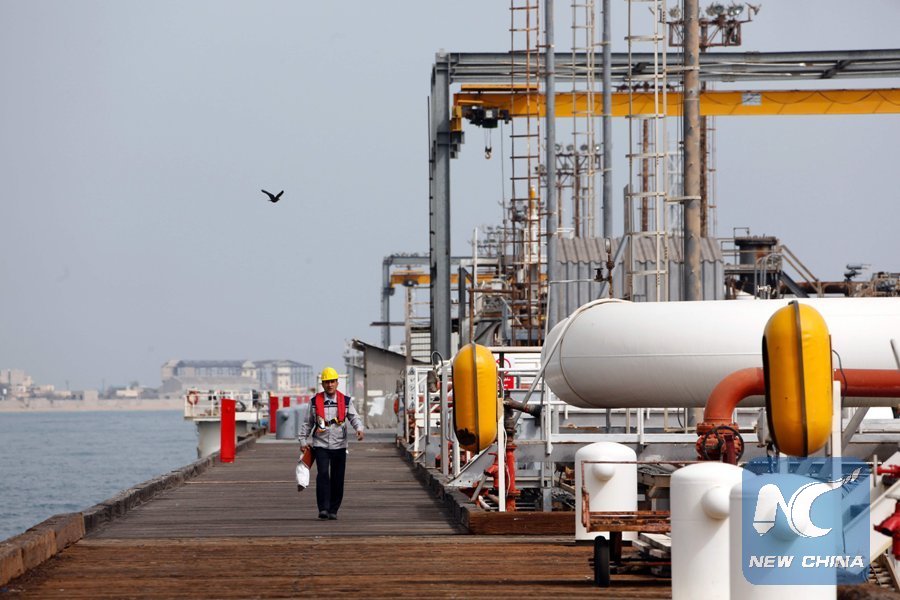 File photo taken on March 12, 2017 shows an Iranian laborer walking the platform of the oil facility in the Khark Island, on the shore of the Gulf. (Xinhua/AFP)