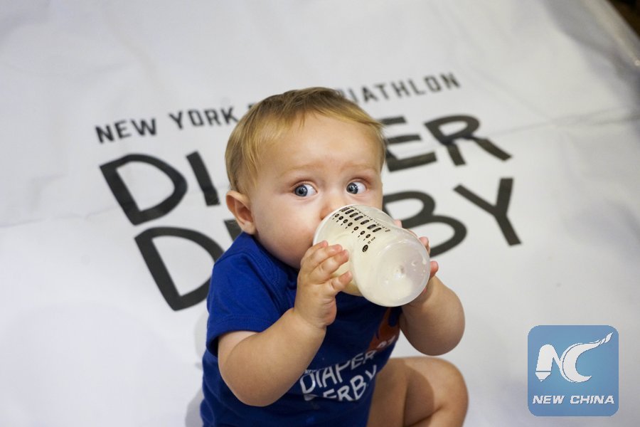 File Photo: A baby drinks milk during the Diaper Derby 2018 in New York, the United States, June 29, 2018. (Xinhua/Lin Bilin)