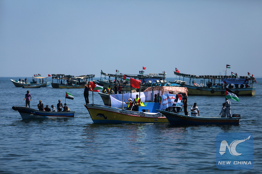 GAZA, July 10 (Xinhua) -- A Palestinian boat set off on Tuesday from Gaza City's seaport to Cyprus in an attempt to defy Israel's 11-year sea and ground blockade imposed on the Hamas-ruled territory.