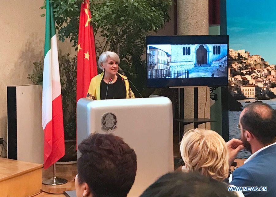 An Italian government official representing the region of Umbria speaks during a press conference on the launch of tourism cooperation between China International Travel Service Limited, Head Office (CITS) and four regions of Italy held in Beijing, capital of China, July 16, 2018. (Xinhuanet/Zhou Xin)