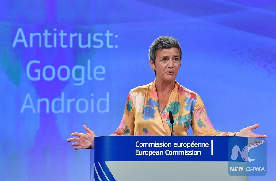 European Union Competition Commissioner Margrethe Vestager gives a joint press at the EU headquarters in Brussels on July 18, 2018. (Xinhua/AFP PHOTO)