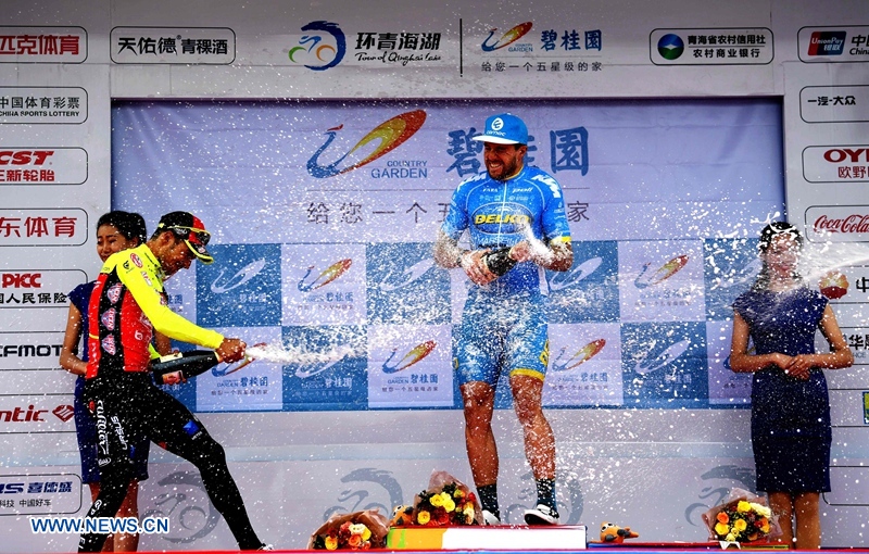 Winners celebrate at the award ceremony of the second stage of the Tour of Qinghai Lake in northwest China's Qinghai Province, on July 23, 2018. (Xinhuanet Photo by Yang Shoude)