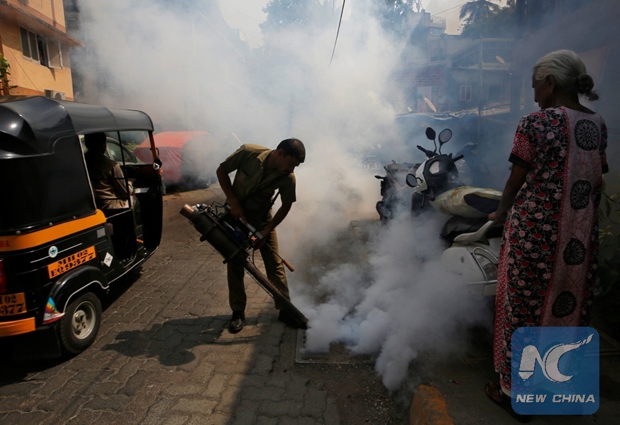A municipal worker fumigates a manhole in a street to prevent the spread of dengue fever and other mosquito-borne diseases in Mumbai, India, May 24, 2018. (Xinhua/REUTERS)