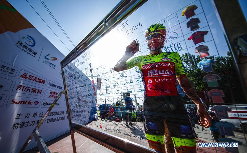 A cyclist signs before the third stage of Tour of Qinghai Lake in northwest China's Qinghai Province, on July 24, 2018. (Xinhuanet Photo by Jia Haiyuan)