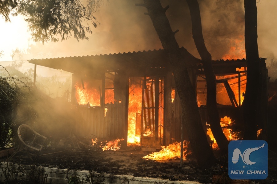 A house is seen burning amid wildfire in the town of Kineta near Athens, Greece, July 23, 2018. (Xinhua/Lefteris Partsalis)