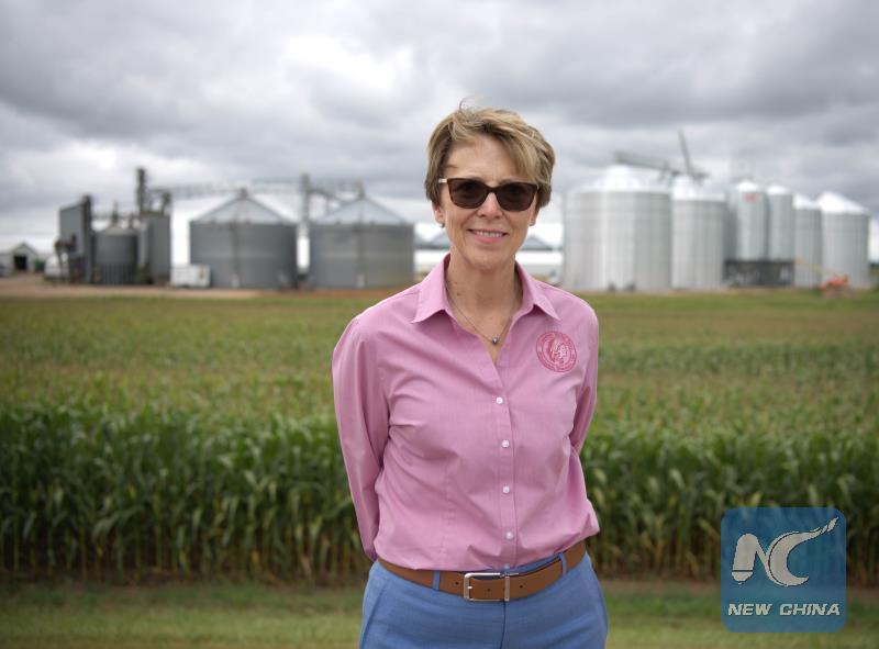 Photo taken on July 26, 2018 shows Cindy Brown, a 62-year-old leading kidney bean processor, stands in front of her factory Located at the suburb of Menomonie, a small town in mid-western Wisconsin, the United States. (Xinhua/Liu Jie)